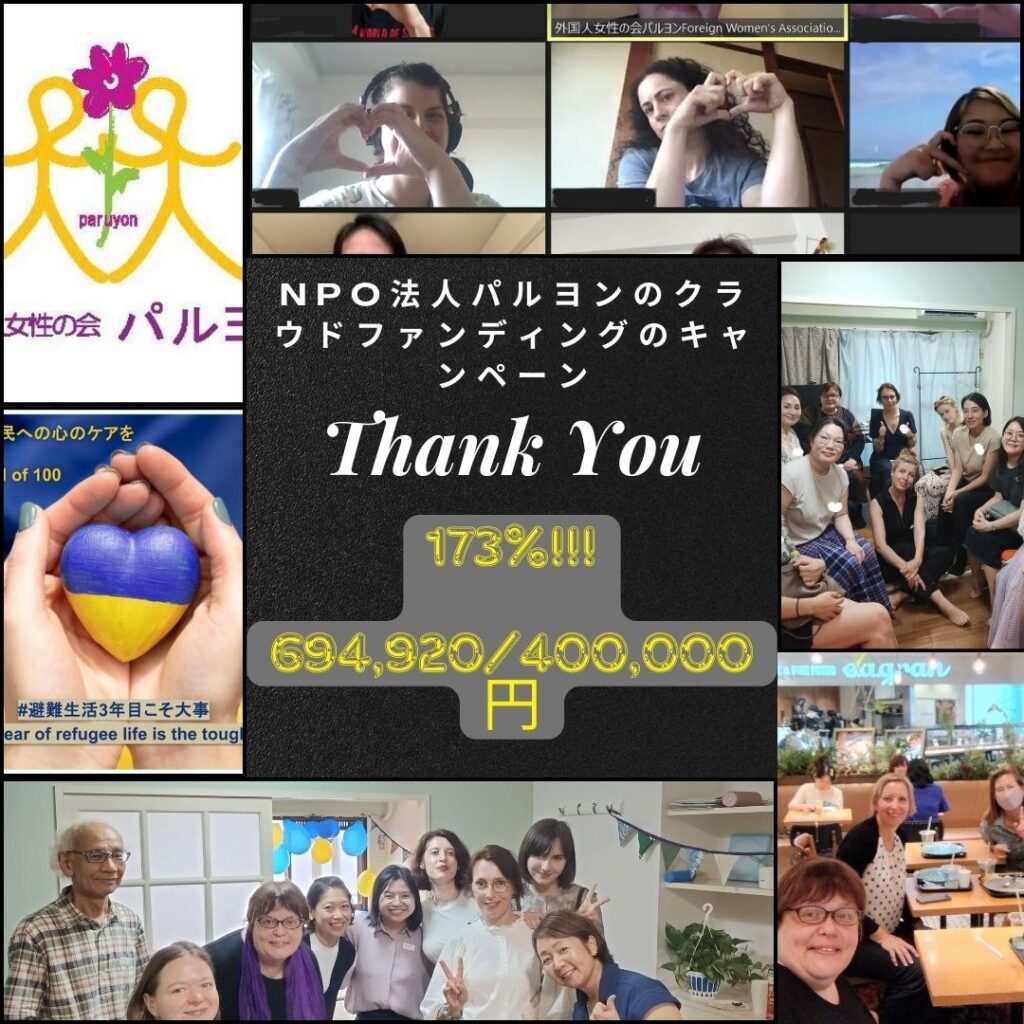 クラウドファンディングキャンペーンの第1目標(400,000円)は100人の日本在住ウクライナ避難民にカウンセリングセッションを提供すること、第2目標(200,000円)は外国人女性の会パルヨンの新しい東京拠点で21人の避難民に対面のカウンセリングセッションを提供することでした。