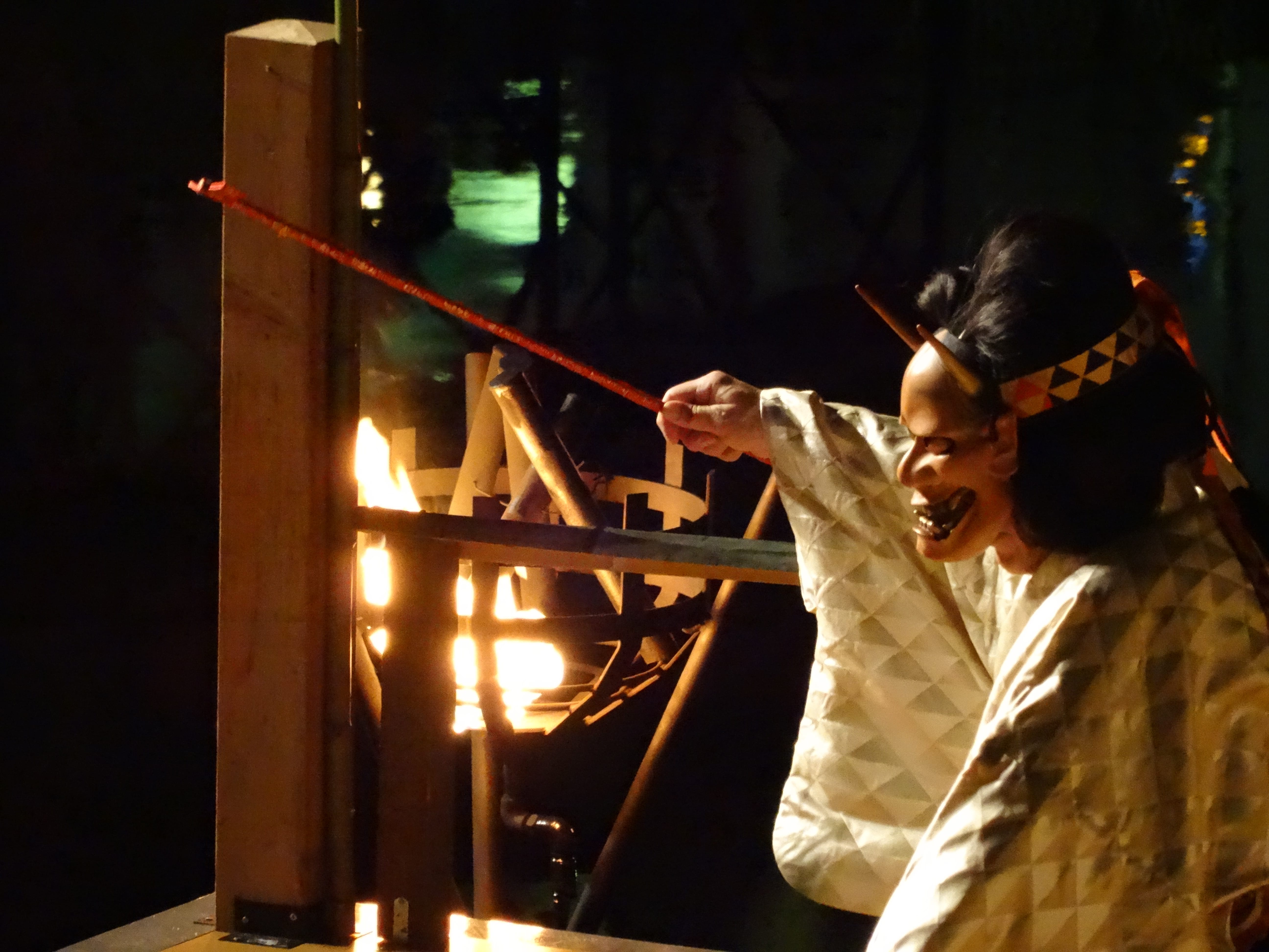 'Takigi Noh' is an exclusive Noh theatre at night, burning fire at both sides of the stage.