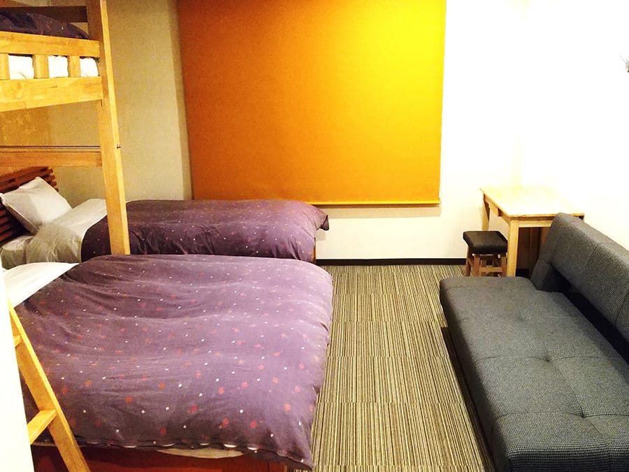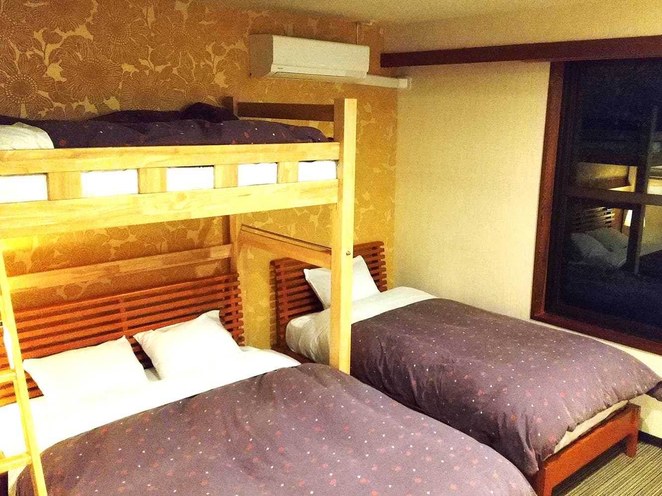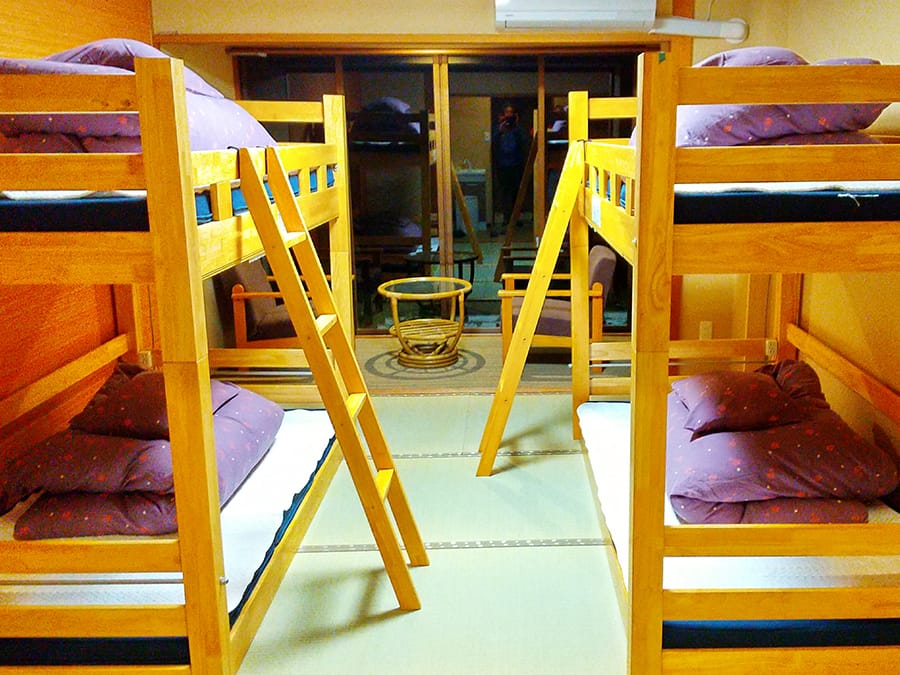 - 最大4名、男女混合シェアルーム、和室のお部屋に2段ベッドを置いたドミトリーです。