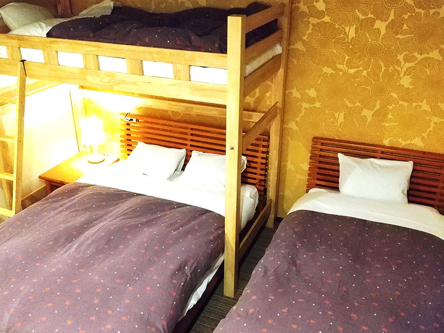 - 4名でのご利用:ダブルベッド1台+シングルベッド1台+ロフトベッド1台+ソファー