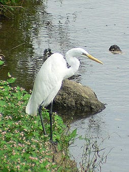 A big bird is standing alone in the river. They move very slowly and stop for quite a long time. They are fishermans trying to catch a fish. Sometimes they are resting on the big Torii gate of Sakurayama shrine.